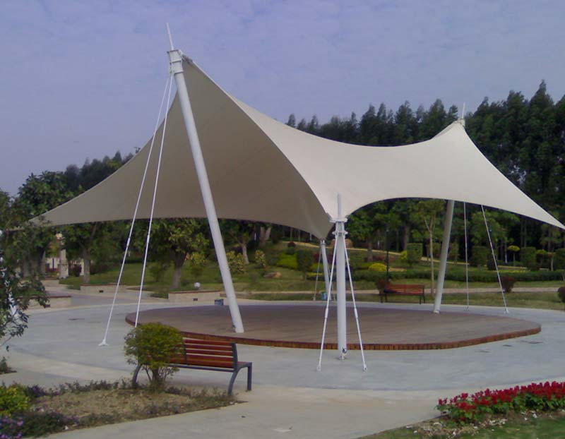 3、膜結構景觀棚懸掛臂安裝焊接:懸掛臂安裝采用焊接, 需檢查焊接節點,調節懸掛臂設計坡度, 準確無誤方能進行焊接。靠邊-條懸掛臂準確無誤后,膜結構景觀棚安裝另一邊一條懸掛臂,就位準確后點焊。